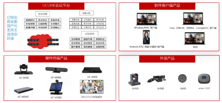 BM系列:保密視頻會議終端,集成身份認證、三員管理及安全審計,符合等保標準,服務于軍工、政府機構。 UCLINK系列:云會議平臺支持公有云/私有云部署,提供屏幕共享、電子白板等協作功能,端到端加密保障數據安全。
