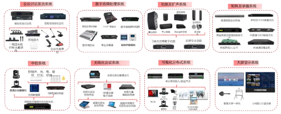 3. “銳視界”音視頻產品線覆蓋會議討論、數字音頻、擴聲、無紙化會議等八大品類,提供一站式全場景解決方案: