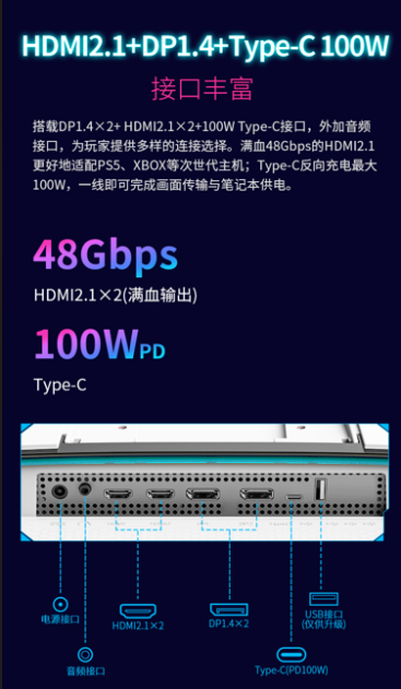 豐富的接口配置,包括雙HDMI 2.1、雙DP 1.4和100W Type-C,滿足了從次世代主機到高性能筆記本的全場景連接需求。