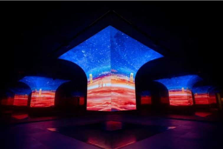 數(shù)字廳打破以往CAVE影院數(shù)字廳的傳統(tǒng)方式,融合多專業(yè)優(yōu)勢,打造具有領(lǐng)先性的超沉浸式數(shù)字演繹場域,在整個(gè)博物館行業(yè)內(nèi)也屬于首創(chuàng)。通過將數(shù)字影片與機(jī)械聯(lián)動,與六面體空間融合,塑造形成沉浸感十足的元域場,觀眾可以置身其中進(jìn)行體驗(yàn),在體驗(yàn)中感受震撼。