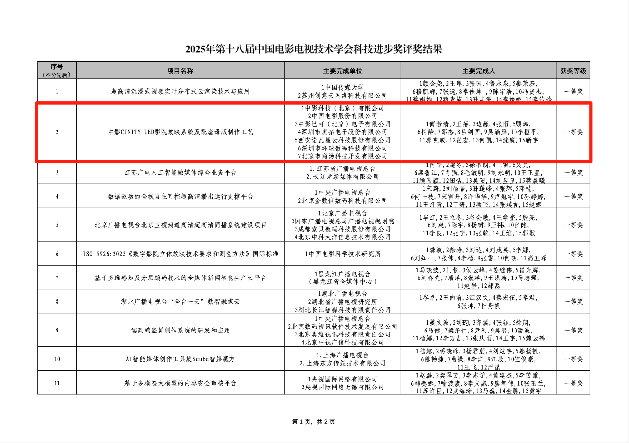 作為經國家科技部批準設立的綜合性科技獎項,中國電影電視技術學會科學技術獎以其公平、公正、嚴謹?shù)脑u審程序著稱,旨在促進廣播影視和網絡視聽領域的技術創(chuàng)新與成果轉化,是國內廣播影視科技領域的最高榮譽之一。經過行業(yè)權威專家的專業(yè)鑒定,中影CINITY LED影院放映系統(tǒng)及配套母版制作工藝在本次評選中憑借卓越的技術創(chuàng)新性和行業(yè)引領性獲得高分,并最終摘得一等獎。