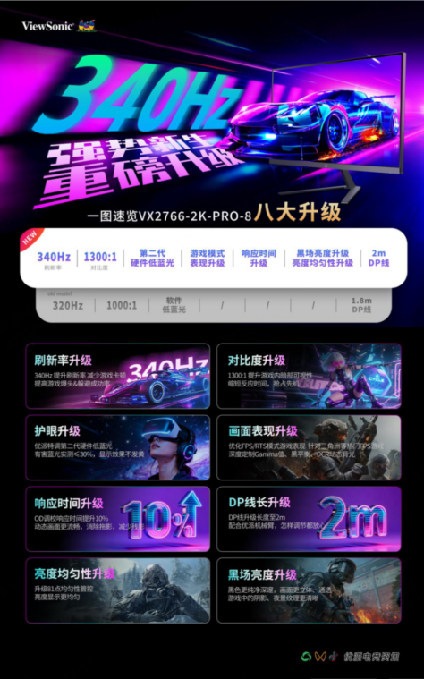 【數(shù)字視聽網(wǎng)訊】中國上海,2025年10月28日——優(yōu)派(ViewSonic)正式推出升級(jí)款電競顯示器VX2766-2K-PRO-8,專為網(wǎng)吧行業(yè)與個(gè)人電競玩家打造,融合340Hz疾速刷新率、Fast IPS面板、HDR10高動(dòng)態(tài)范圍與多項(xiàng)電競功能,支持1ms GTG疾速響應(yīng)時(shí)間,全面提升游戲畫面表現(xiàn)與操作舒適度。該產(chǎn)品采用27英寸QHD分辨率設(shè)計(jì),兼容Freesync/G-sync,兼顧高清畫質(zhì)與流暢度,成為網(wǎng)吧電競空間進(jìn)階的理想選擇。