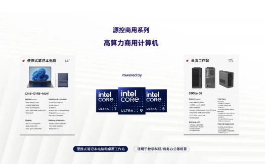另外,源控商用業務推出了基于英特爾® 酷睿™ Ultra 5/7/9 處理器的高算力商用計算機,便攜式筆記本電腦和桌面工作站可為教學科研和商務辦公等場景提供堅實方案。以源控新一代桌面工作站為例,其搭載了英特爾® 酷睿™ Ultra第二代芯片,可選Ultra 5/7/9 處理器,內部采用榫卯結構,可進行模塊快拆,超擴展架構以及抽拉式防塵網便于維護使用,支持四個內存插槽最高達128GB,可進行“雙M.2 SSD+雙3.5英寸 HDD”擴展,配合動態散熱可為商務辦公或專業設計帶來更加便捷、高效的使用體驗。