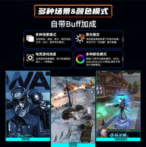 VX27G58-2K-10內置五向OSD搖桿按鍵,操作更直觀,切換模式更高效。除此之外,它還配備電競游戲準星功能和黑色穩定技術,可提升玩家的操作體驗及畫面的暗部細節;其內置的多種游戲模式(FPS、RTS、MOBA),玩家可根據場景快速切換,獲得更契合的視覺體驗。