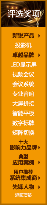 即將走過2019,有哪些品牌及新品獨樹一幟,憑借良好的市場口碑及成績闖入了我們的視線,又有哪些品牌在某個領(lǐng)域獨占鰲頭?這一年又有哪些產(chǎn)品獲得不錯的市場評價,投影機(jī)行業(yè)2019年度十大新銳產(chǎn)品,2019年度矩陣切換十大卓越品牌,2019年度大屏拼接十大卓越品牌,2019年度智能平板十大卓越品牌,2019年度數(shù)字標(biāo)牌十大卓越品牌,2019年度會議系統(tǒng)十大卓越品牌,2019年度視頻會議十大卓越品牌,2019年度專業(yè)音響十大卓越品牌,2019年度LED顯示屏十大卓越品牌,2019年度十大系統(tǒng)集成商將在您的熱情參與下產(chǎn)生。讓我們拭目以待。