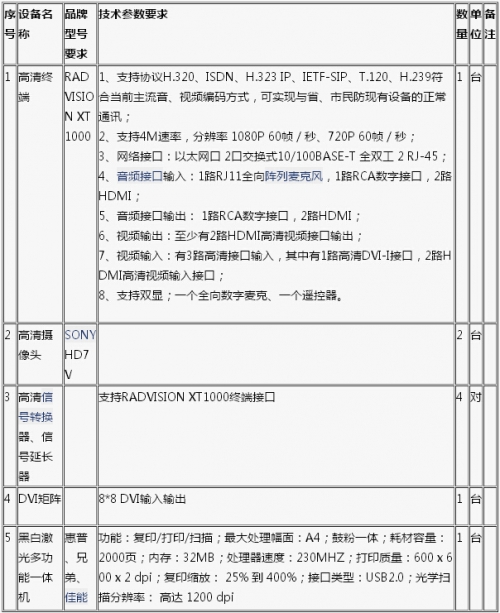 備注:1.投標人須從要求品牌中選擇任一品牌進行投標,選擇其他品牌的其投標無效。2.投標人所投產品須優于或等同于上述配置及技術參數要求。3、所有貨物(含配件)必須是原廠原裝原盒產品,不得有拆機、改裝產品。4.投標人必須實現本項目的所有信號與江蘇省、鹽城市人防信號的正常連接(費用含在總報價內,不另計取。人防專用光纖由招標人提供)。